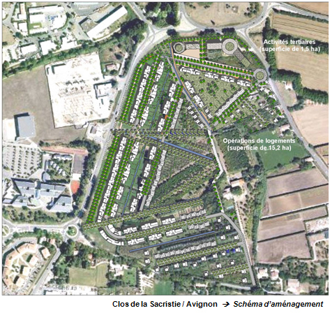 - Parc public > 2 ha avec organisation de noues paysagées, bassins de rétention et d’agrément, alignements d’arbres remarquables conservés